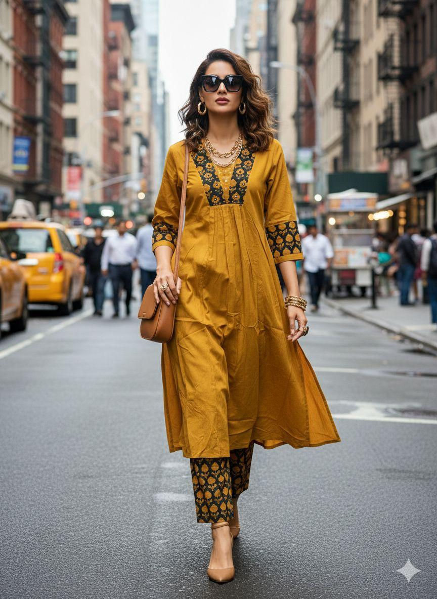 Mustard Printed Cotton Kurta Set